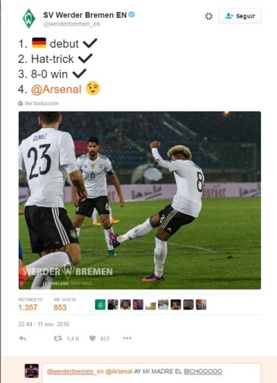 ¡Vacilada épica del Werder Bremen al Arsenal en Twitter!