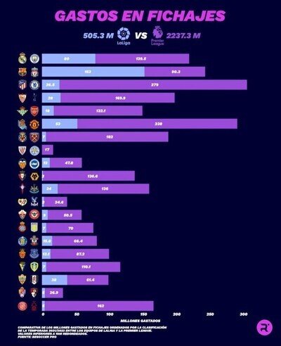 La diferencia de gasto entre LaLiga y la Premier League